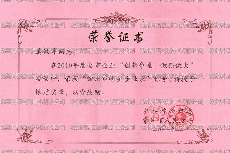 2、常州科研試制中心有限公司被鐘樓區授予納稅十強企業,授牌省工程技術研究中心。公司董事長兼總經理姜漢軍被鐘樓區授予優秀企業家的光榮稱號。
