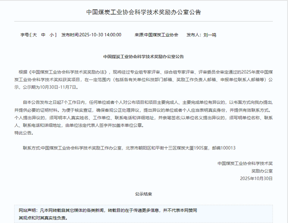 公司榮獲2025年度中國煤炭工業協會科學技術獎二等獎
