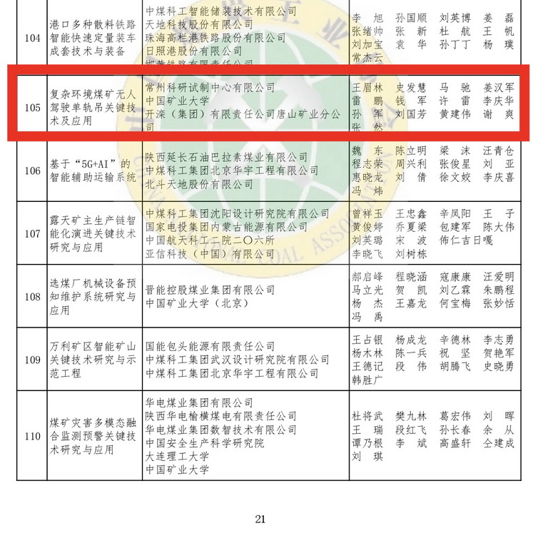 近日,從中國煤炭工業協會傳來喜訊,常州科研試制中心有限公司申報的《復雜環境煤礦無人駕駛單軌吊關鍵技術及應用》項目經過專家評審、評審委員會審定后順利通過公示,榮獲2025年度中國煤炭工業協會科學技術獎二等獎。